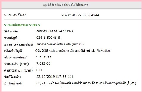 โดยได้รับบริจาคเข้าบัญชีส่วนตัวจากทางเฟสบุ๊ค ประมาณ 4,500 บาท ค่ะ